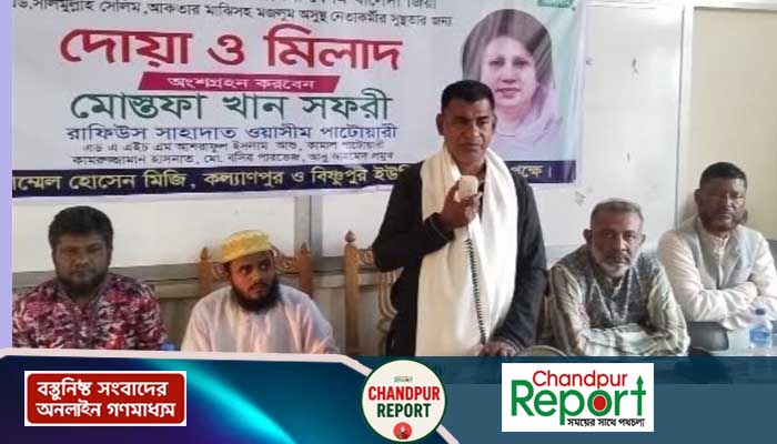 কল্যাণপুর ইউনিয়ন বিএনপির পক্ষে স্থানীয় বিএনপি নেতা মোজাম্মেল হোসেন মিজির আয়োজনে আয়োজিত তিনবারের সাবেক প্রধানমন্ত্রী বেগম খালেদা জিয়া চাঁদপুর জেলা বিএনপির সাধারণ সম্পাদক এডভোকেট সলিমুল্লাহ সেলিম ও চাঁদপুর পৌর বিএনপি’র সভাপতি আক্তার হোসেন মাঝির আসু সুস্থতায় আয়োজিত মিলাদ ও দোয়ার মাহফিলে মোনাজাত পূর্বে প্রধান অতিথির বক্তব্যে উপরোক্ত কথাগুলো বলেন।