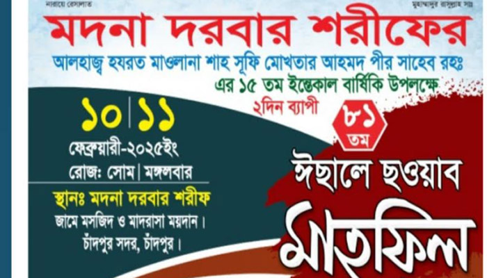 আগামীকাল ১০ ফ্রেরুয়ারি ও ১১ ফেব্রুয়ারি ২০২৫, সোম ও মঙ্গলবার মদনা দরবার শরীফের বার্ষিক ইসালে ছাওয়াব ওয়াজ ও দোয়ার মাহফিল।