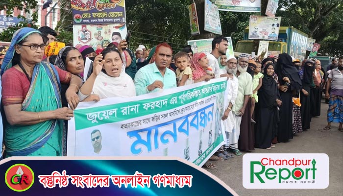 চাঁদপুরে হত্যার বিচারের দাবিতে লাশ নিয়ে থানার সামনে বিক্ষোভ ও মানববন্ধন