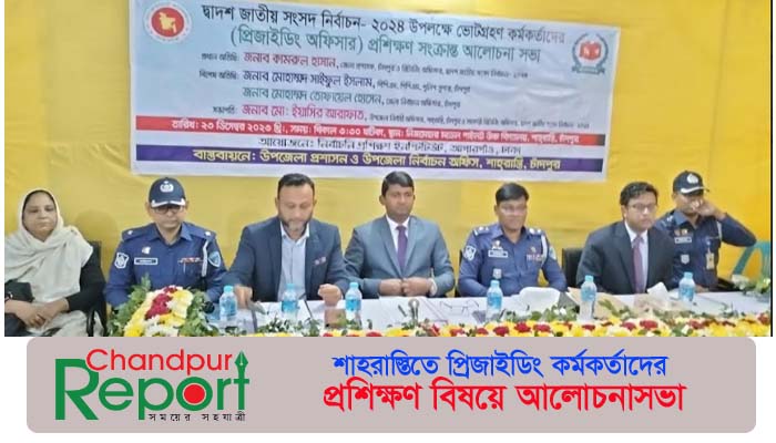 চাঁদপুরের শাহরাস্তিতে দ্বাদশ জাতীয় সংসদ নির্বাচন উপলক্ষে ভোটগ্রহণ কর্মকর্তাদের (প্রিজাইডিং অফিসার) প্রশিক্ষণ সংক্রান্ত আলোচনা সভা অনুষ্ঠিত হয়েছে। শনিবার (২৩ ডিসেম্বর) বিকেলে পৌর শহরের নিজমেহার পাইলট উচ্চ বিদ্যালয়ে এটি অনুষ্ঠিত হয়।