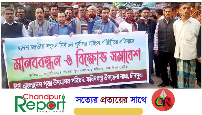 শনিবার (২০ জানুয়ারি) বিকালে বাংলাদেশ পূজা উদযাপন পরিষদ ফরিদগঞ্জ উপজেলা শাখার উদ্যোগে থানার মোড়ে আয়োজিত মানববন্ধন ও বিক্ষোভ সমাবেশ উপজেলা শাখার আহŸায়ক লিটন কুমার দাসের সভাপতিত্বে ও সদস্য সচিব প্রবীর চক্রবর্তীর সঞ্চালনায় অন্যান্যের মধ্যে বক্তব্য রাখেন, উপজেলা পূজা উদযাপন পরিষদের সদস্য পরেশ চন্দ্র দাস, গনেশ চন্দ্র লোধ, ডা: মানিক চন্দ্র দাস মঙ্গল, হিন্দু মহাজোটের সম্পাদক প্রদীপ দাস, পৌর পূজা কমিটির সদস্য পলাশ চন্দ্র দাস, কৃষ্ণকমল দাস, ইউনিয়ন কমিটির অমৃত পাল হৃদয় প্রমুখ।