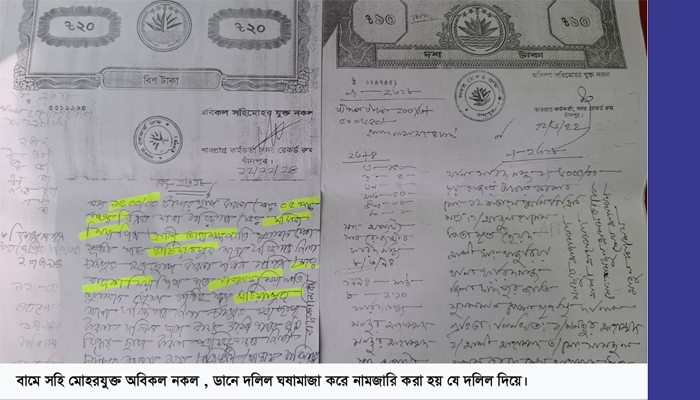 তার সৃজনকৃত নামজারি খতিয়ান অনুসন্ধান করে দেখা গেছে, ১৯৮৮ সালের ৪৯৮২নং ও ১৯৯৪ সালের ২৩১৮নং দলিল দুইটি ঘষা-মাজা ও ছল-চাতুরির বিষয়টি ধরা পড়ে। ৪৯৮২নং দলিলে দাতা গ্রহিতা ঠিক থাকলেও ভুমির পরিমান ৪৪ শতক এর স্থানে দলিল ঘষা-মাজা করে ১ একর (একশত শতক) করা হয়েছে। সাবেক ৫৮ দাগ হালে ১০০ নং দাগ দলিলে না থাকলেও ওই দলিল দিয়ে ওই দাগের ৫৬ শতক জমি আবুল হাসেম নামে খারিজ করে নেয়া হয়েছে।