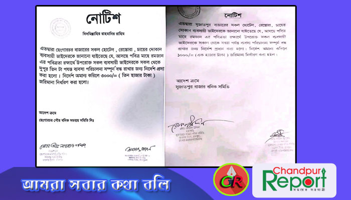 গতকাল শনিবার রাতে ছেংগারচর পৌর বাজার বণিক সমিতি ও সুজাতপুর বাজার সমিতির সভাপতি ও সাধারণ সম্পাদকের স্বাক্ষরিত নোটিশের জানানো হয়েছে পবিত্র মাহে রমজানের পবিত্রতা রক্ষায় দিনের ৩টা পর্যন্ত হোটেল-রেস্তোরাঁ বন্ধ রাখার জন্য। এ ঘটনায় সামাজিক যোগাযোগ মাধ্যমে প্রশংসায় ভাসছে বাজার ব্যবস্থাপনা কমিটি।