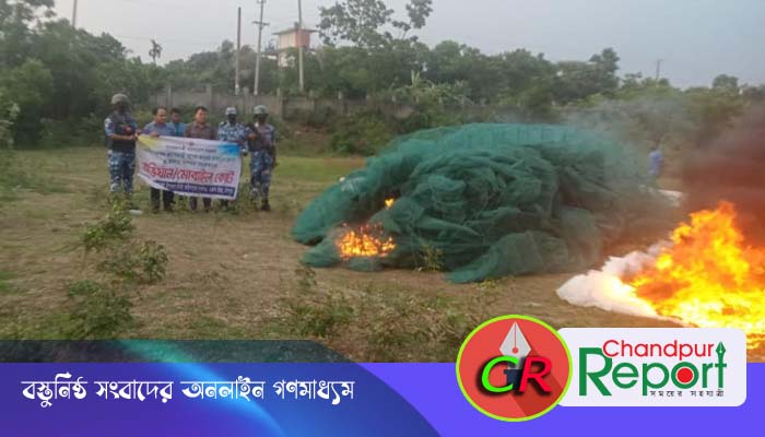মতলব উত্তরে ৬ লাখ মিটার অবৈধ জাল ও ৪শ’ চায়না দুয়ারী জাল আগুনে পুড়িয়ে বিনষ্ট
