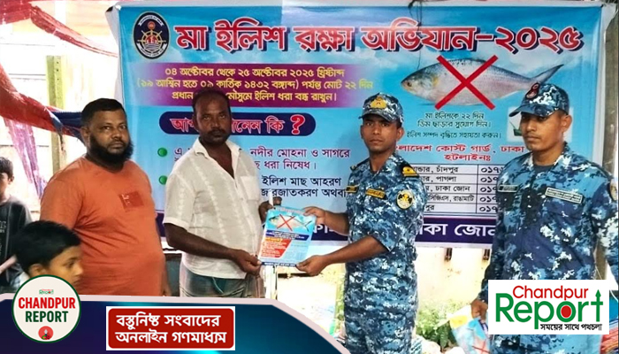 মা ইলিশ রক্ষা অভিযান সফল করতে চাঁদপুরে চলছে কোস্ট গার্ডের জনসচেতনতামূলক কার্যক্রম